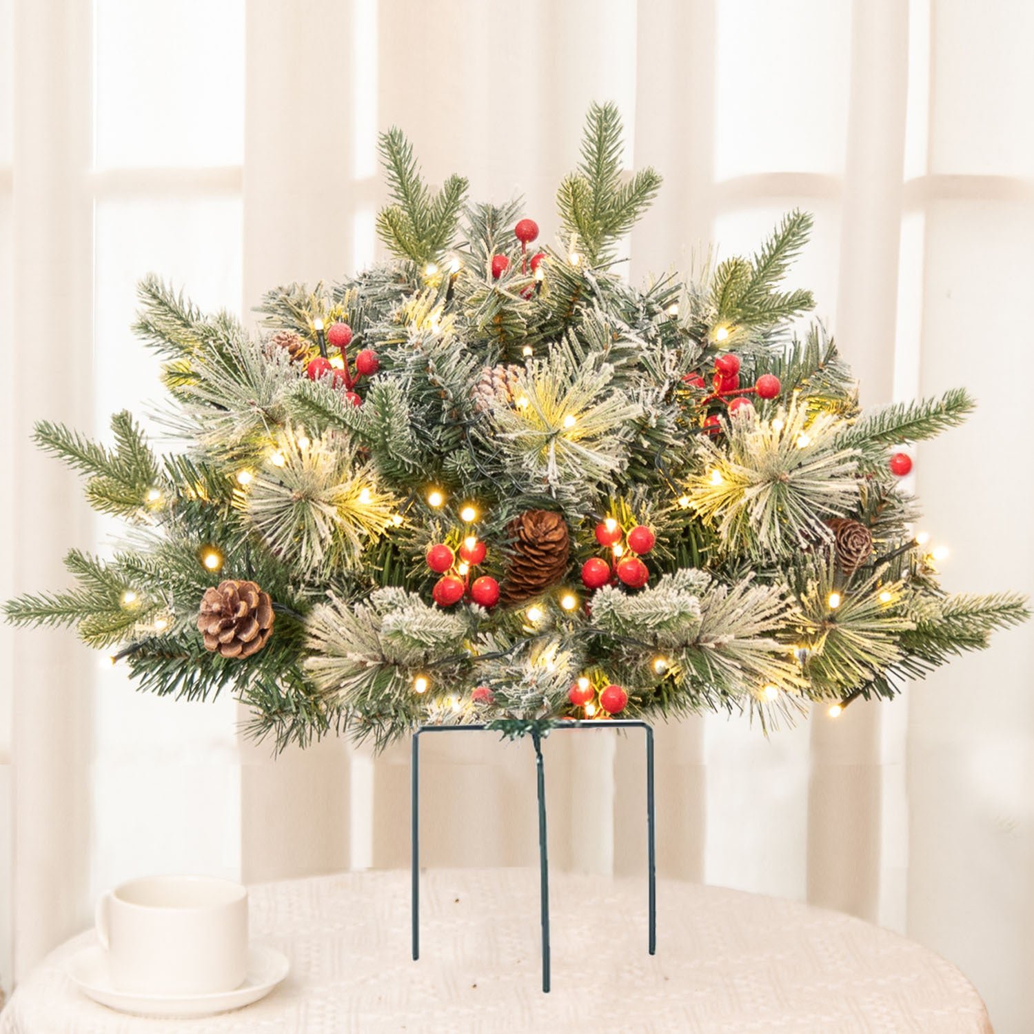 Decorated with pine cones, red berries, and a tripod stake with realistic evergreen branch tips, it can be used to fill an urn or container, and this full-bodied piece is as charming as the real thing.
